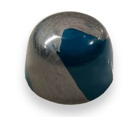 A toasted hazelnut surrounded with cashew butter on top of a hazelnut milk chocolate ganache in a milk chocolate shell, hand painted in dark blue with a smoky quartz swirl accent.