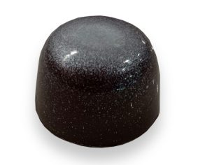 A fresh orange gelée on top of a dark chocolate ganache with a dark chocolate shell, hand painted with a pearlized top.