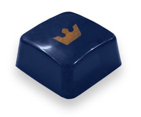 A thick caramel chew topped with toasted pecans in a dark chocolate shell, hand painted in metallic blue with a gold crown accent.
