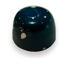 A house-made vanilla infused caramel on top of an almond praline ganache in a dark chocolate shell, hand painted in teal blue with white splash accent.