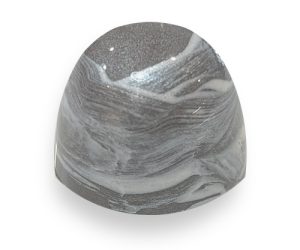 A house-made marshmallow creme on top of a milk chocolate ganache and graham cracker crust with a dark chocolate shell, hand painted in smoky quartz with a pearl swirl accent.